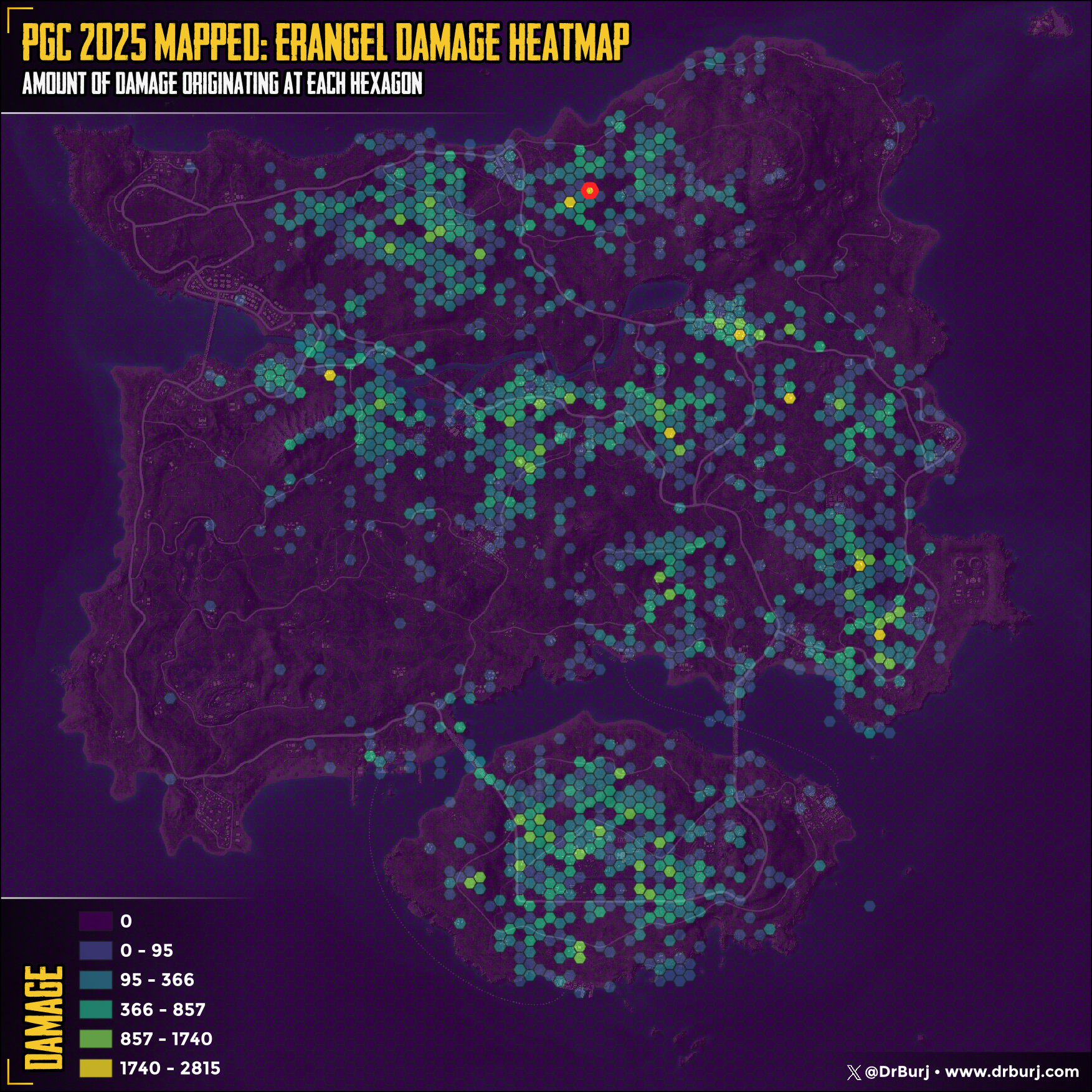 If we measure which hexagon the most damage was dealt from (that is, where players were stood when they dealt damage), then this spot (circled red) at the north of Erangel comes out on top.
