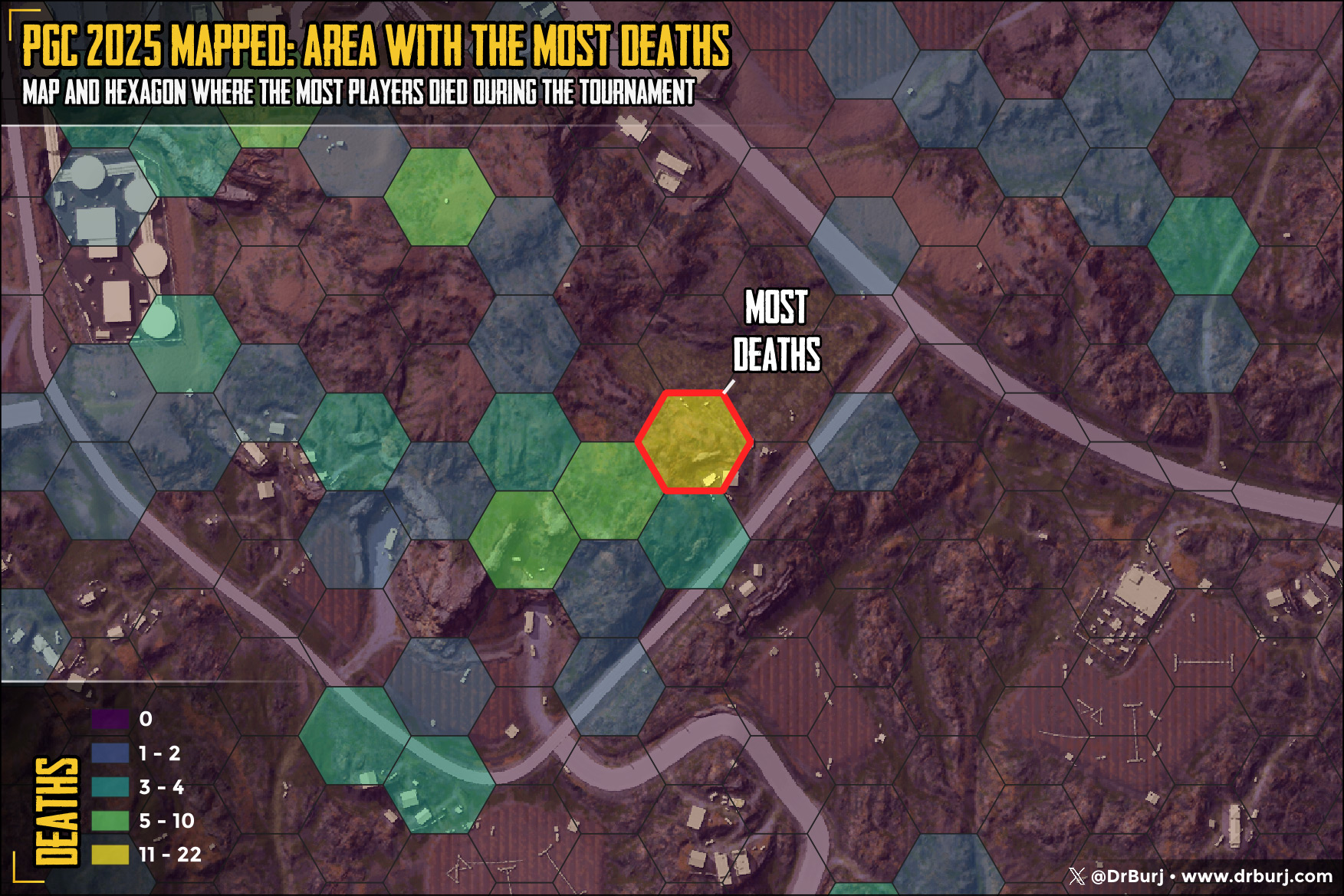 If every map were split into 50 metre by 50 metre hexagons, this spot (circled red) on Miramar saw the most deaths over the course of the tournament.
