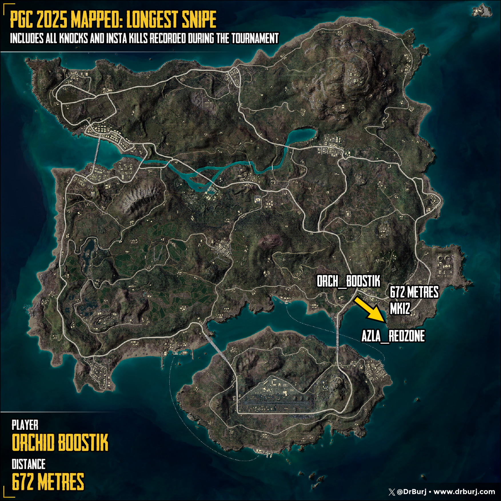 Hello! I'm a professional cartographer by day, making maps and analysing spatial data. With the 2025 PUBG Global Championship now over (congrats FULL SENSE!), I thought it would be fun to dive into the telemetry data and make some maps highlighting interesting stats, strats, and fun facts from the tournament.