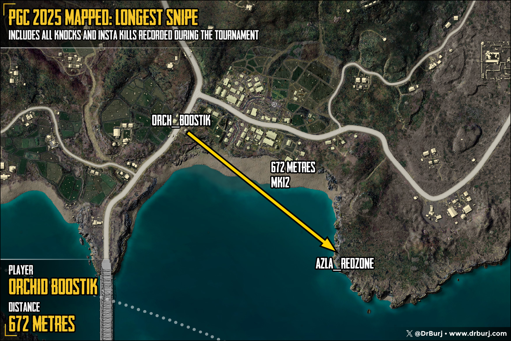 The longest snipe of the tournament was by Team Orchid's boost1k-, who took out Redzone (AZLA PENTAGRAM) on Erenagel from 672 metres away. For comparison, the average distance (counting all knocks and instant kills with guns) during the tournament was 89 metres, so this is an impressive shot.